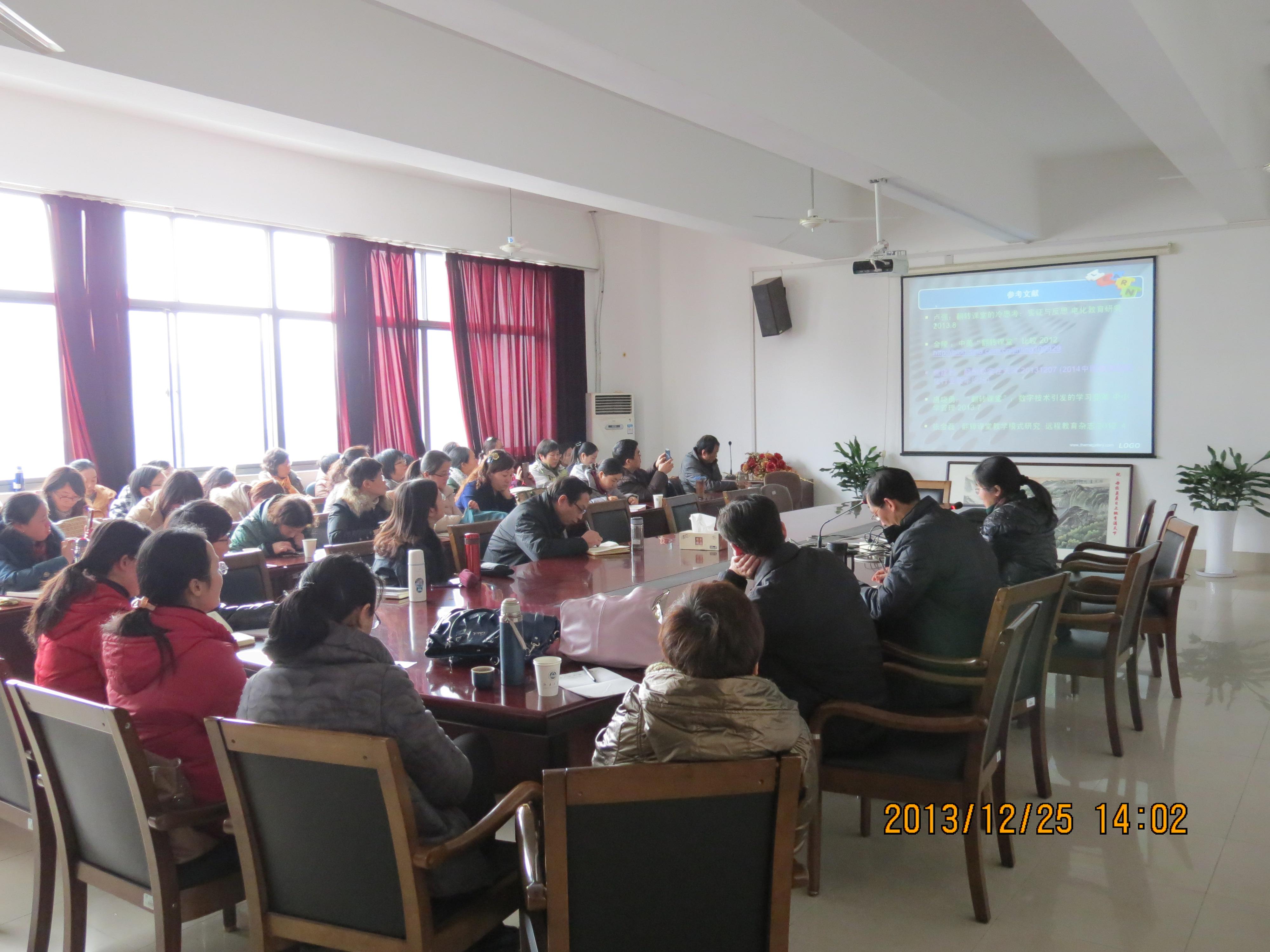 龚晓斌院长对于国外新型教学模式的本土化适应性问题做了点评,如翻转课堂模式对于教师答疑能力提出了挑战,更适合于小班教学;移动学习对于网络条件以及学生自主能力的要求较高等。接着,他提出英语高考改革形势下大学英语教师应该对教学模式改革进行深入探究。教师们一起观看了龚院长接受教育电视台关于英语高考改革的采访视频。他认为从国家语言政策视角来看,多年的全民英语热后适当降温还是合理的;改革应关注于如何教学以及如何考查;学生可以根据兴趣和专业选择英语学习的方向。教师们积极讨论了新形势下的对策。丁光宇、邢嘉锋两位老师结合在海外孔子学院做汉语教师的经历谈了国外学生的学习状况以及如何激发学生学习积极性。张效国老师对中学英语教学颇有研究,从语言政策的角度探讨了大学英语教学与科研的新思路。
